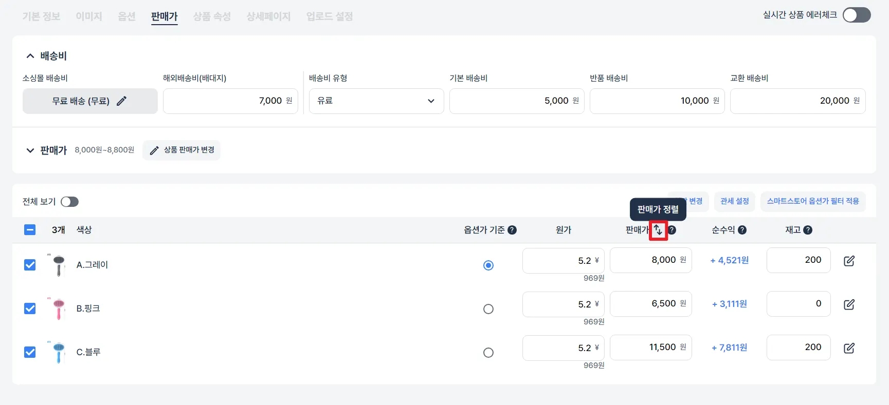 판매가 탭의 판매가 옆 화살표 버튼을 눌러서 상품을 판매가 기준으로 정렬해 보세요.