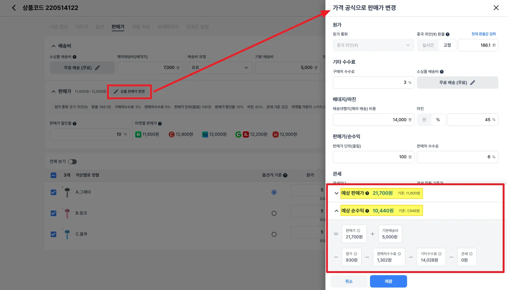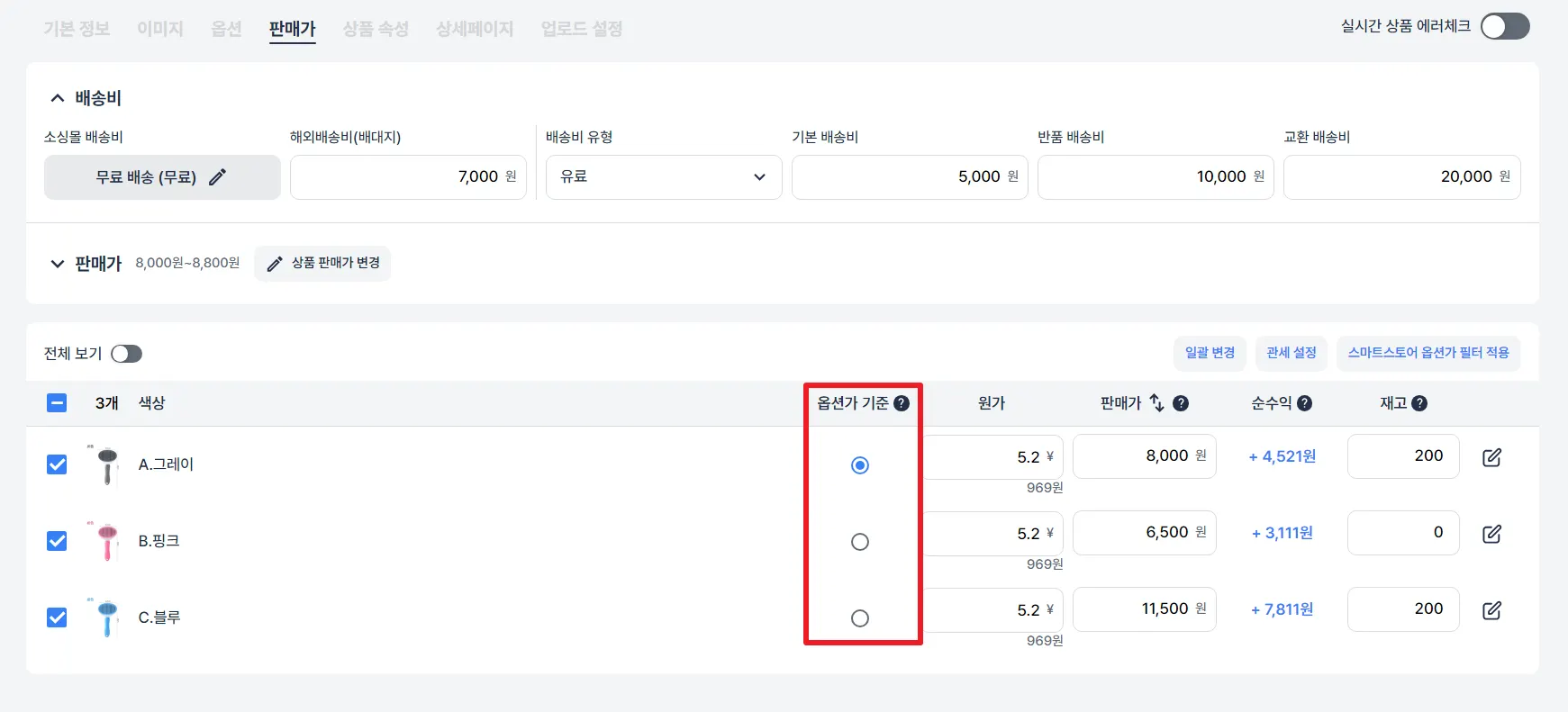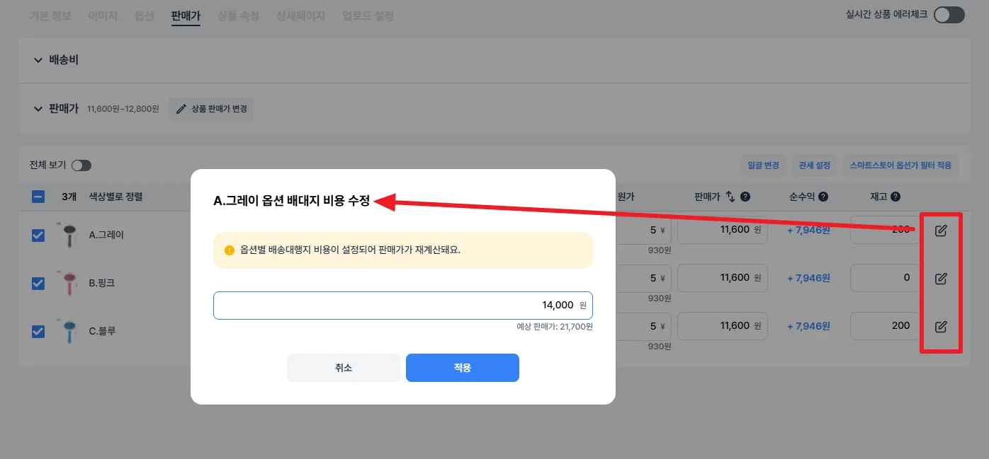 옵션가 기준 상품에 대해, 수정 전과 수정 후 판매가 및 순이익을 바로 확인할 수 있습니다.