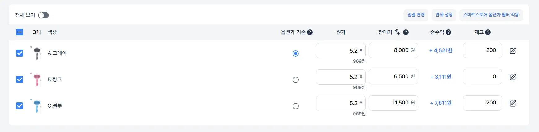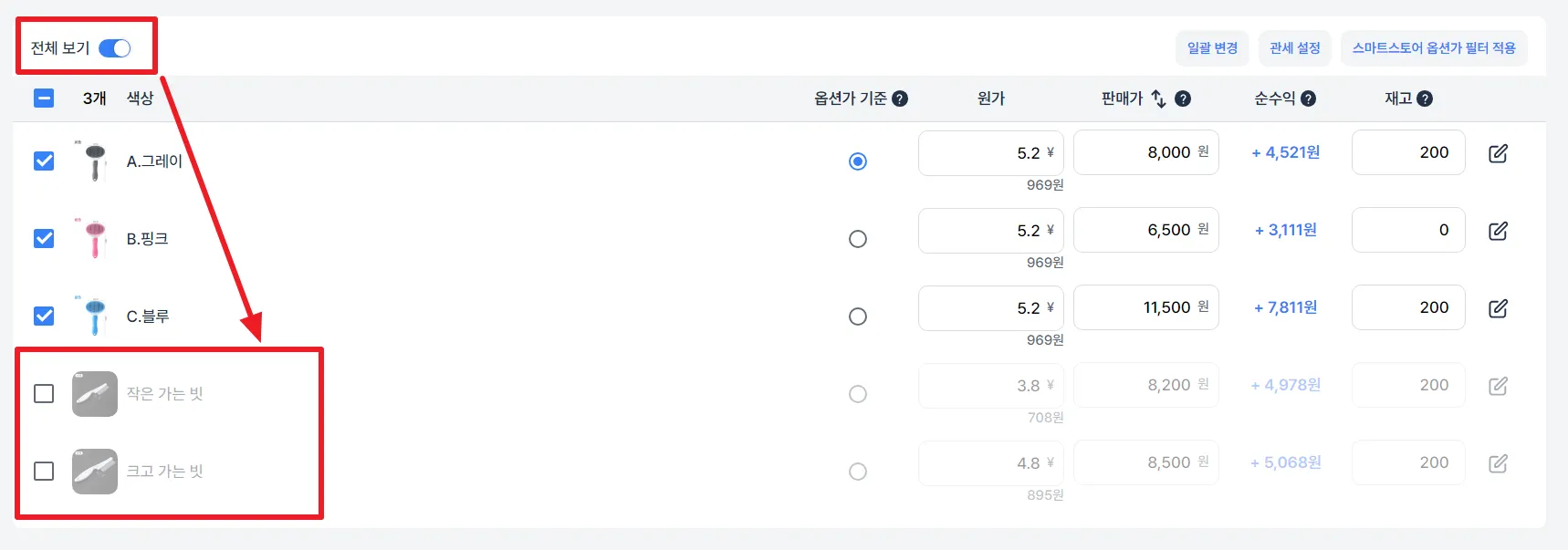 판매하기로 선택한 옵션들의 판매가만을 보고 싶다면 전체 보기 를 꺼 주세요.