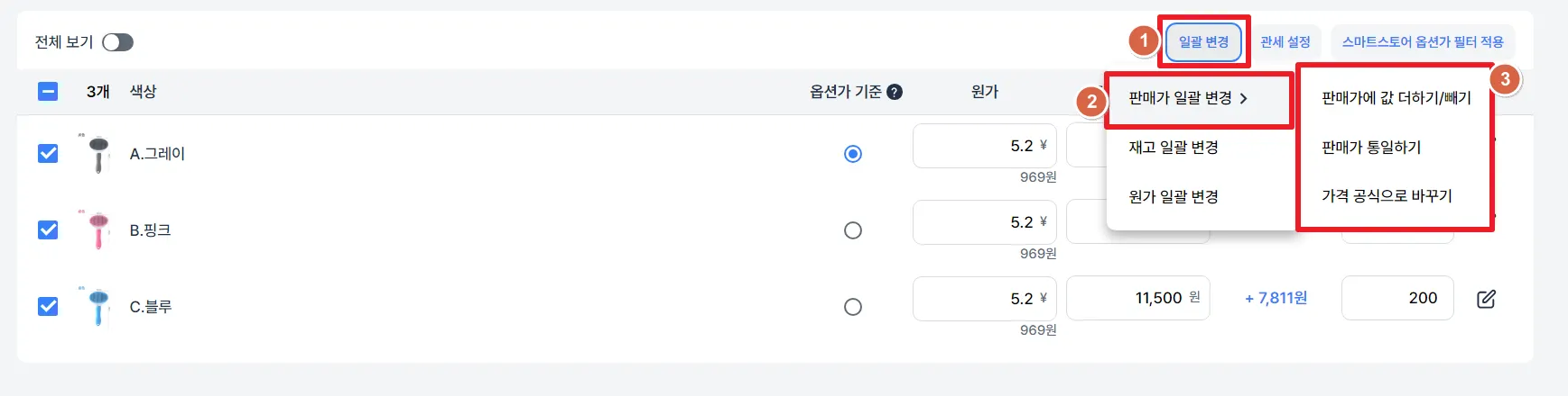 판매가를 일괄 변경하는 방법은 총 3가지가 있어요.