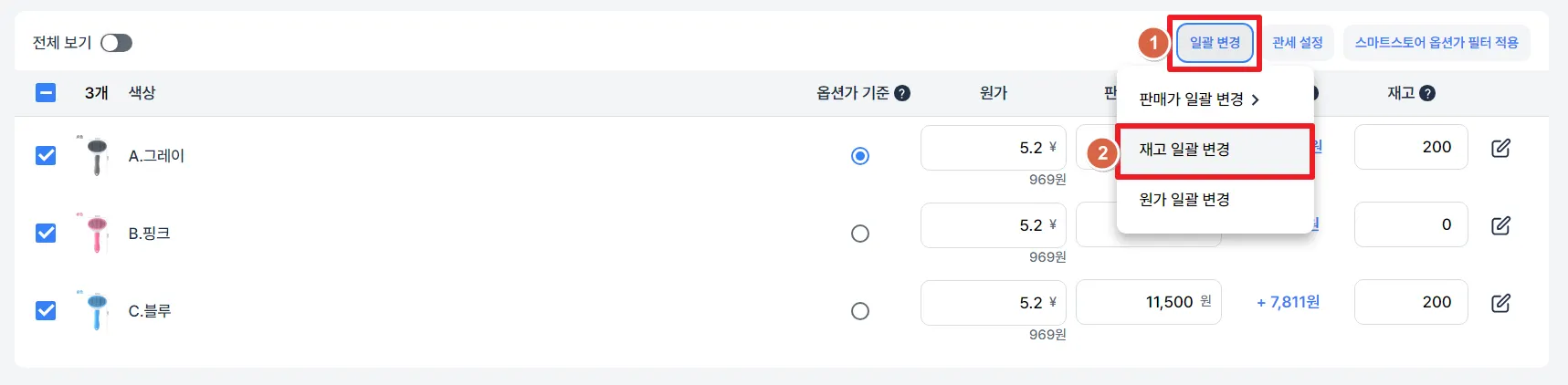 일괄 변경 - 재고 일괄 변경 버튼을 통해 모든 옵션의 재고를 한 번에 수정할 수 있어요.