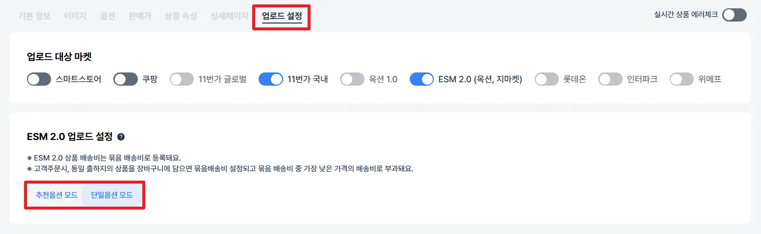 ESM 2.0 상품명은 다른 마켓들과 달리, 기본 정보탭이 아닌 업로드 설정 탭의 ESM 2.0 업로드 설정 - 추천옵션 모드 또는 단일옵션 모드에서 변경할 수 있습니다.