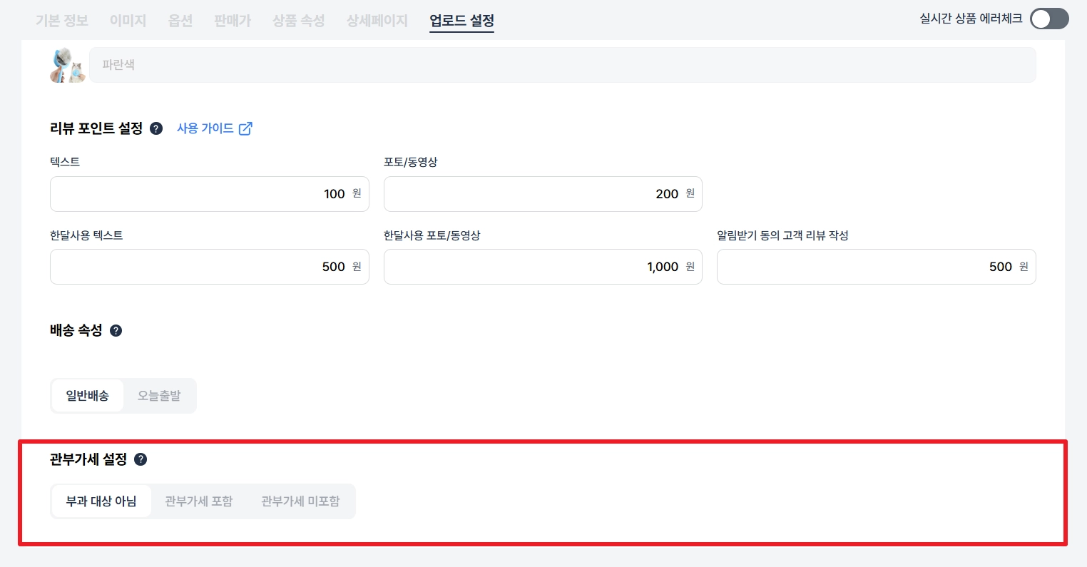 상품의 관부가세 관련 내용을 설정할 수 있어요. 기본적으로 상품 수집 당시 윈들리 기본 설정에서 적용되어 있던 내용을 따르며, 상품별로 조정도 가능해요.