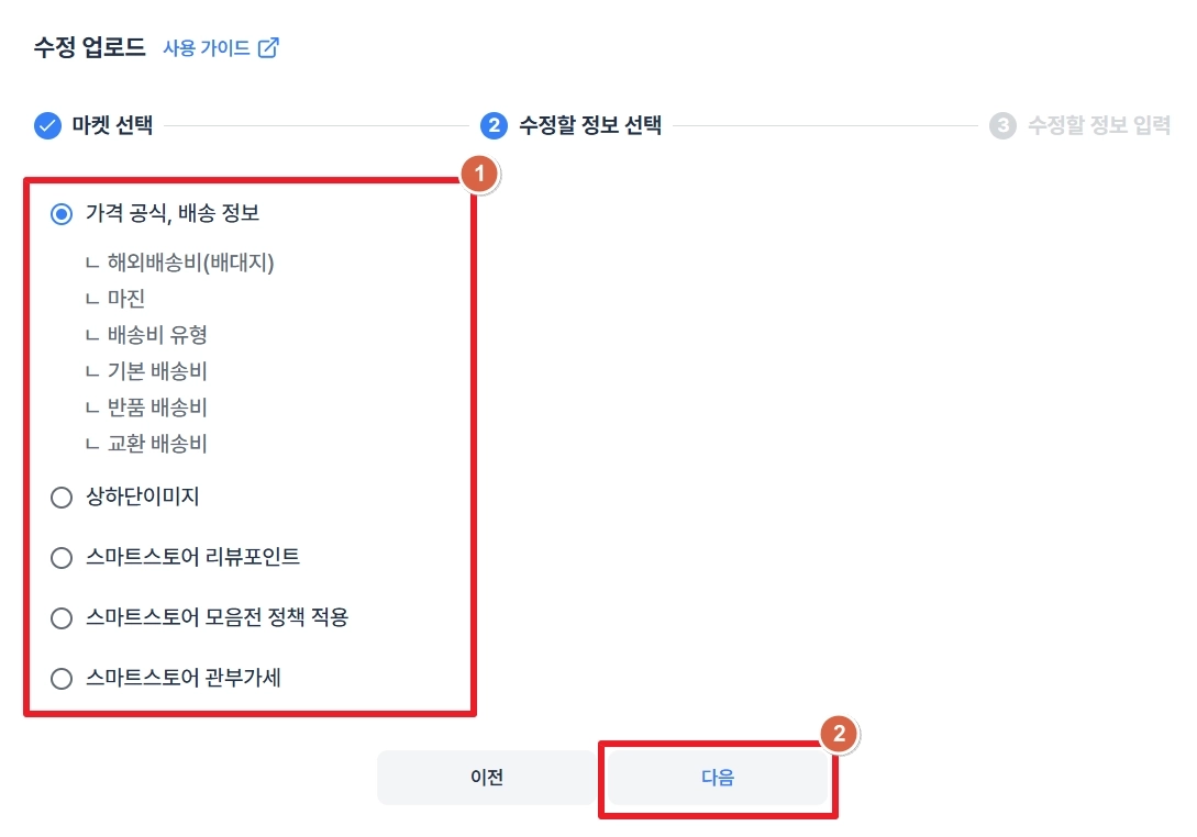 한번에 수정 업로드하고 싶은 상품을 선택(