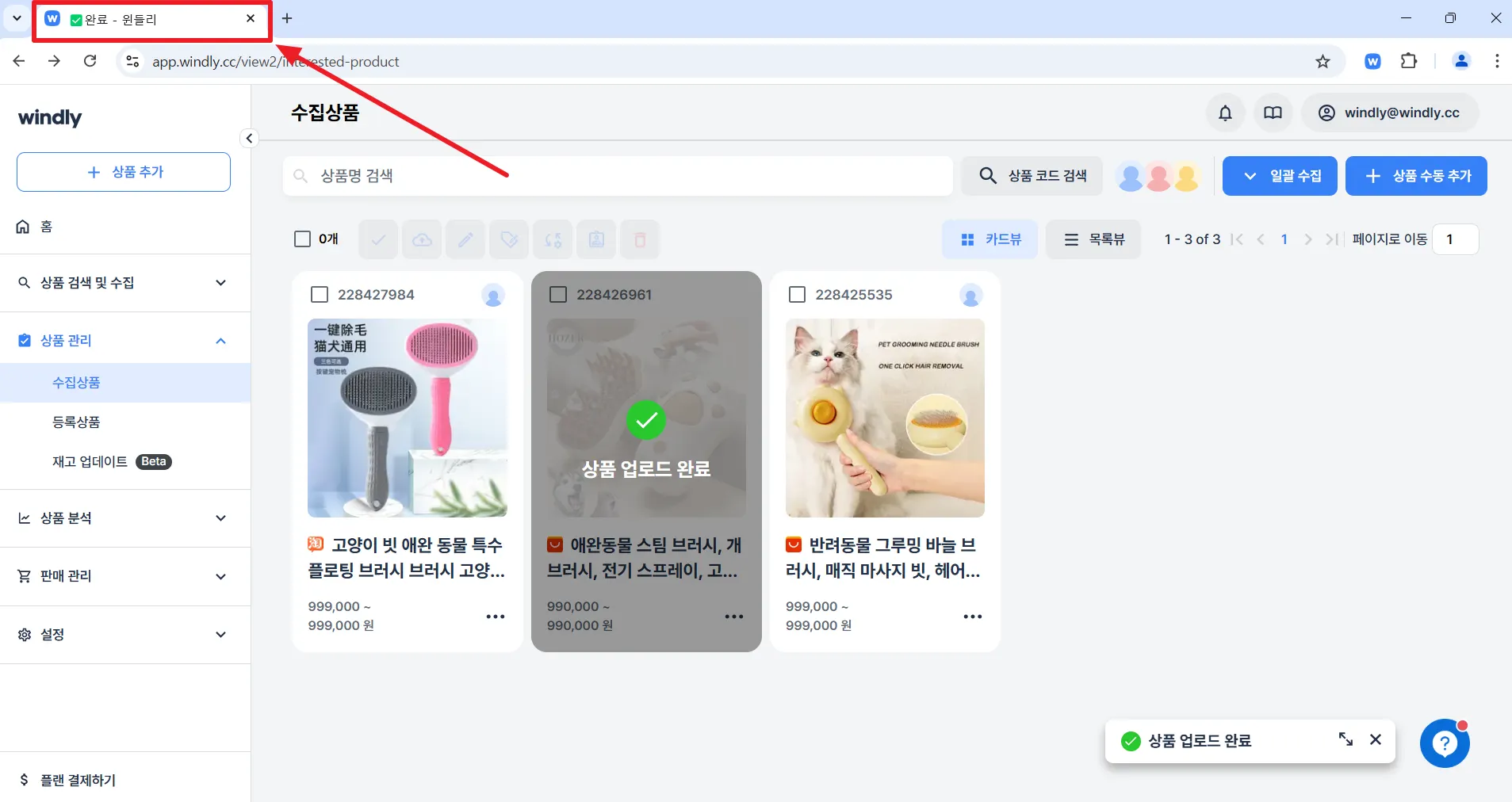 일괄 업로드가 언제 완료되었는지는 아래와 같이 윈들리 탭에서