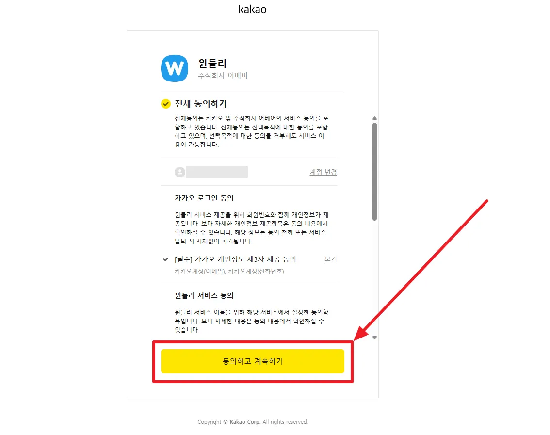 필수 항목에 모두 동의한 뒤, ‘동의하고 계속하기’ 버튼을 클릭해 주세요.