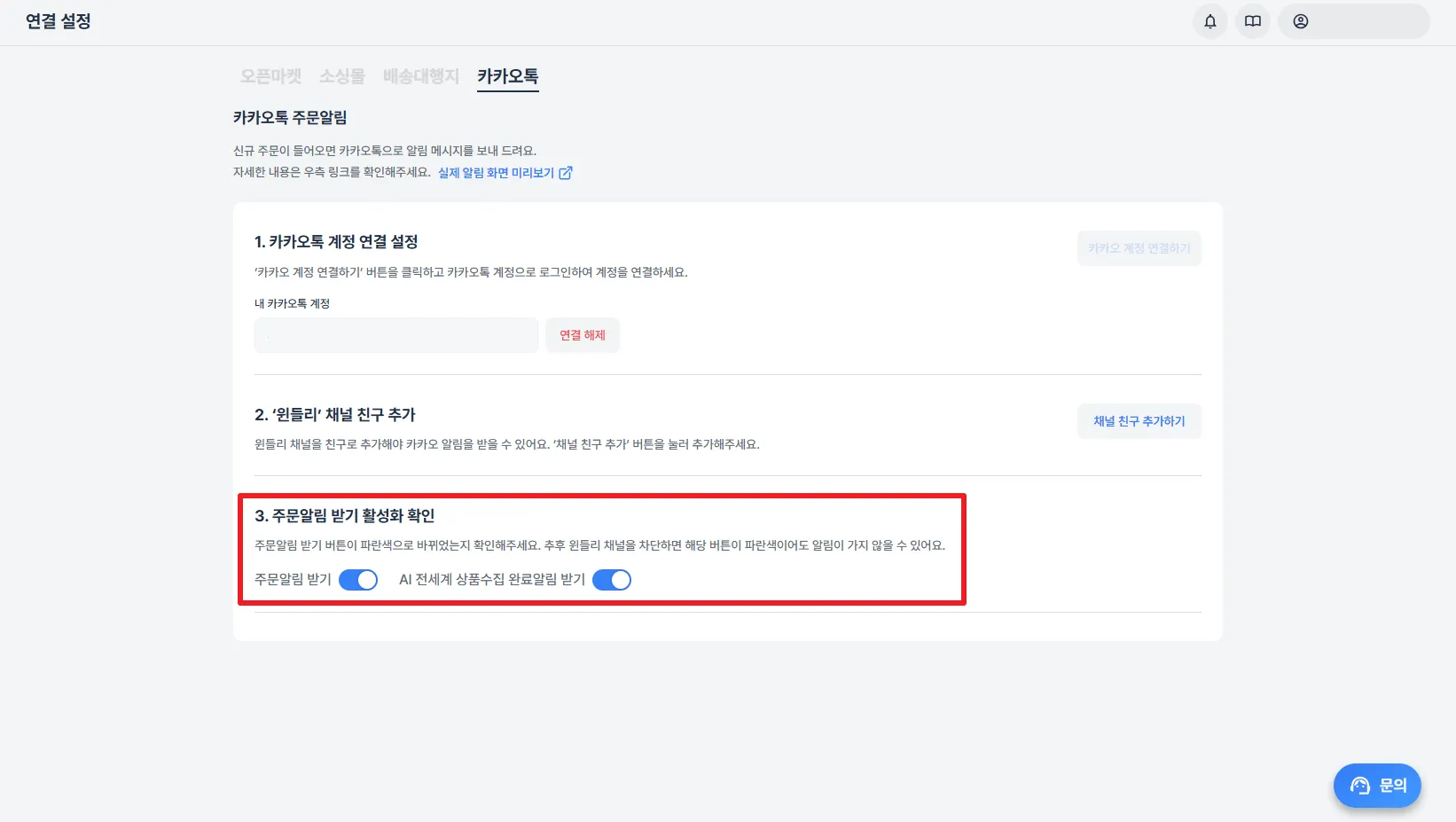 카카오 연결설정 화면의 ‘3. 주문알림 받기 활성화 확인’ 영역에서, 원하는 알림 받기 버튼을 클릭하여 설정해 주세요.
