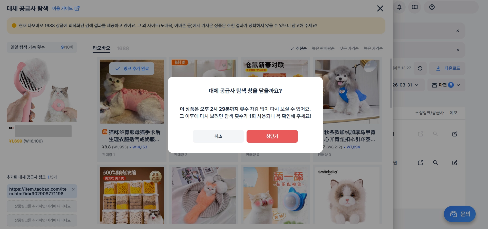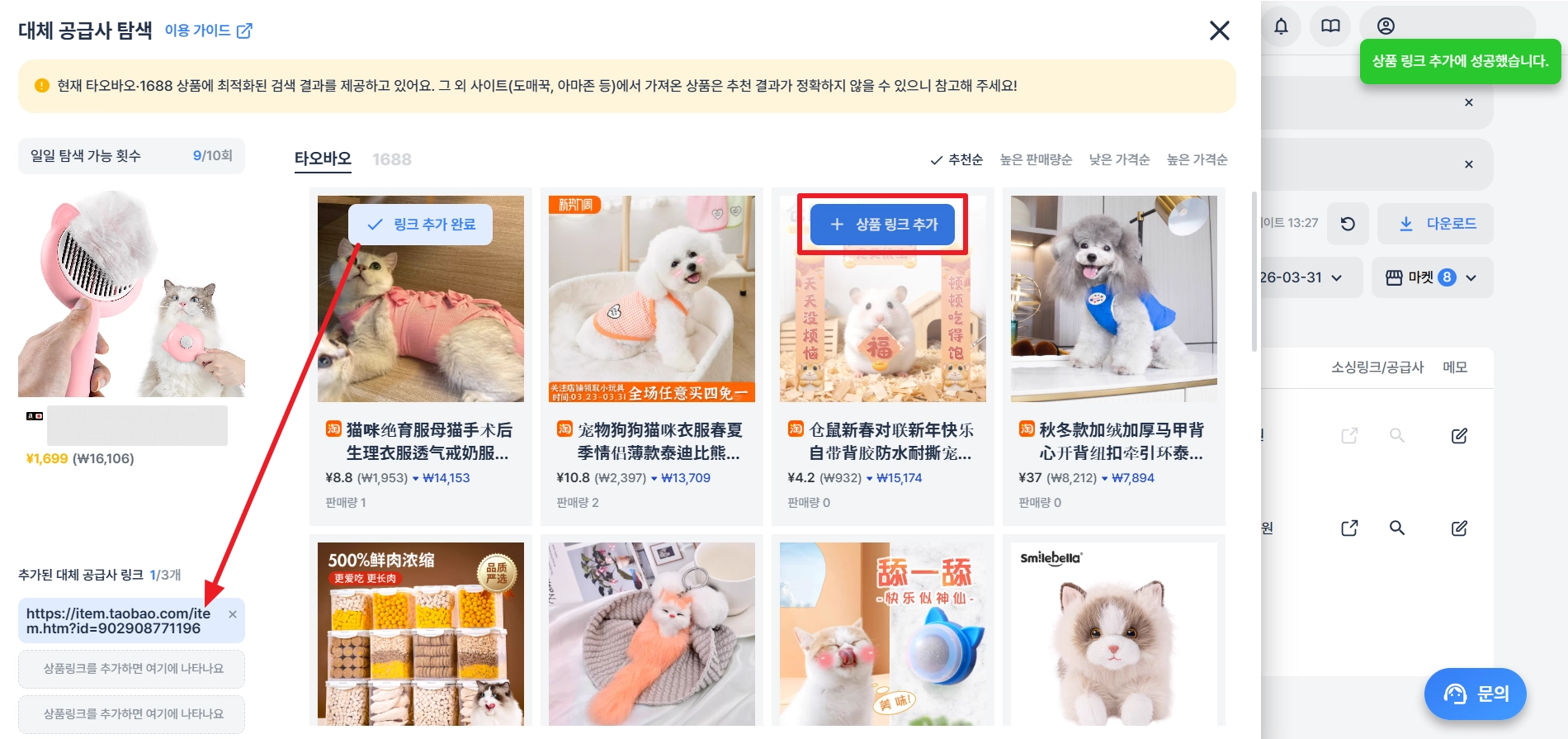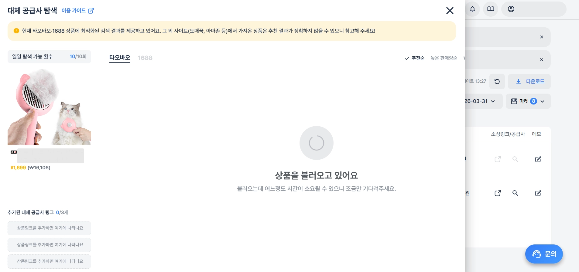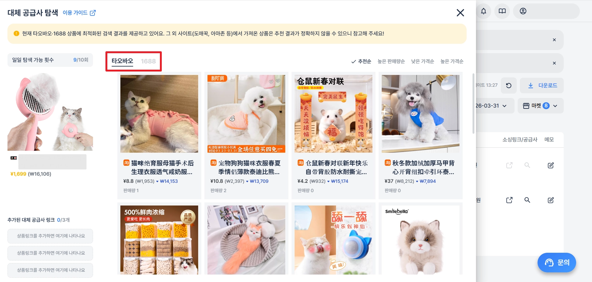 대체 공급사는 타오바오와 1688에서 모두 확인할 수 있으니, 탭을 자유롭게 클릭하며 여러 상품들을 확인해 보세요.