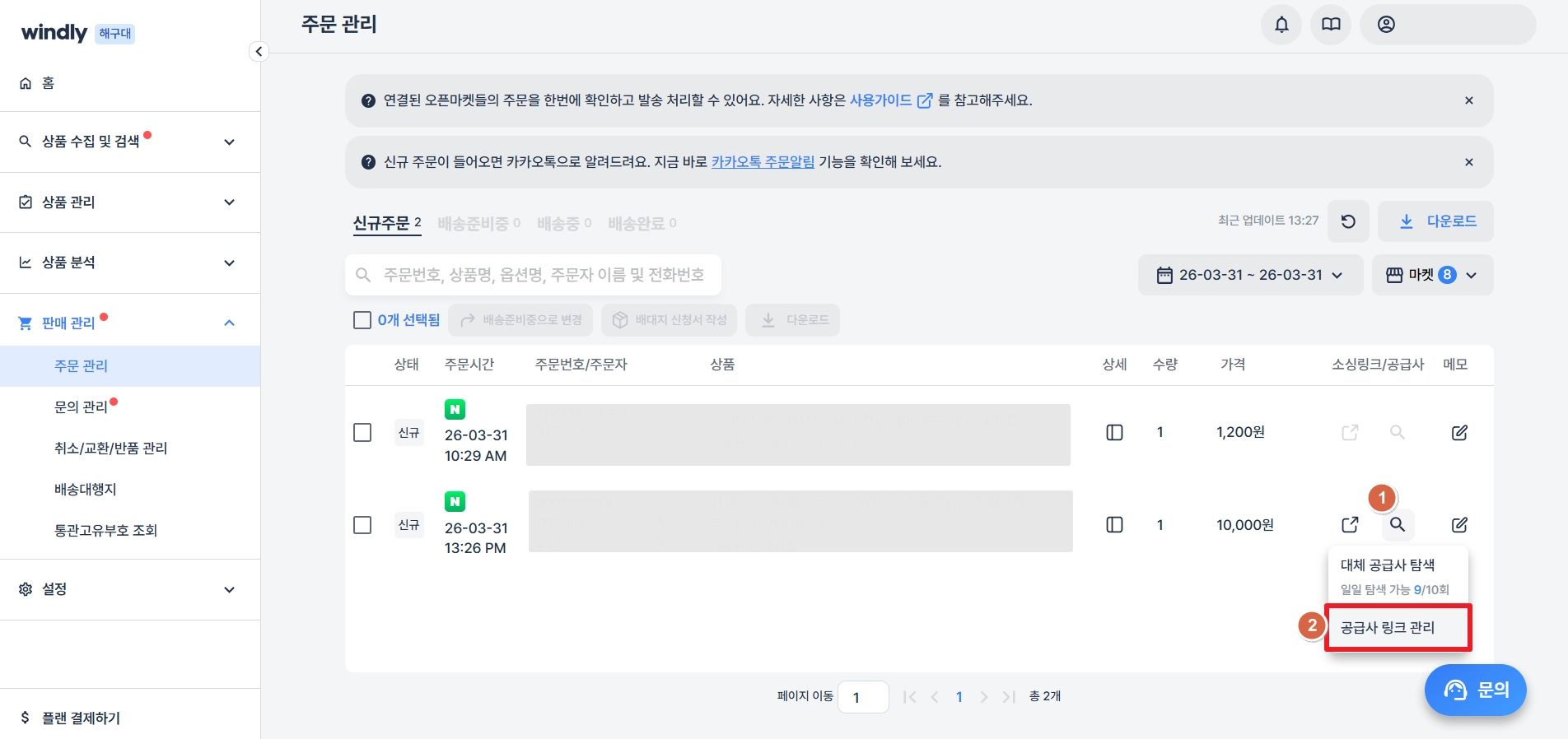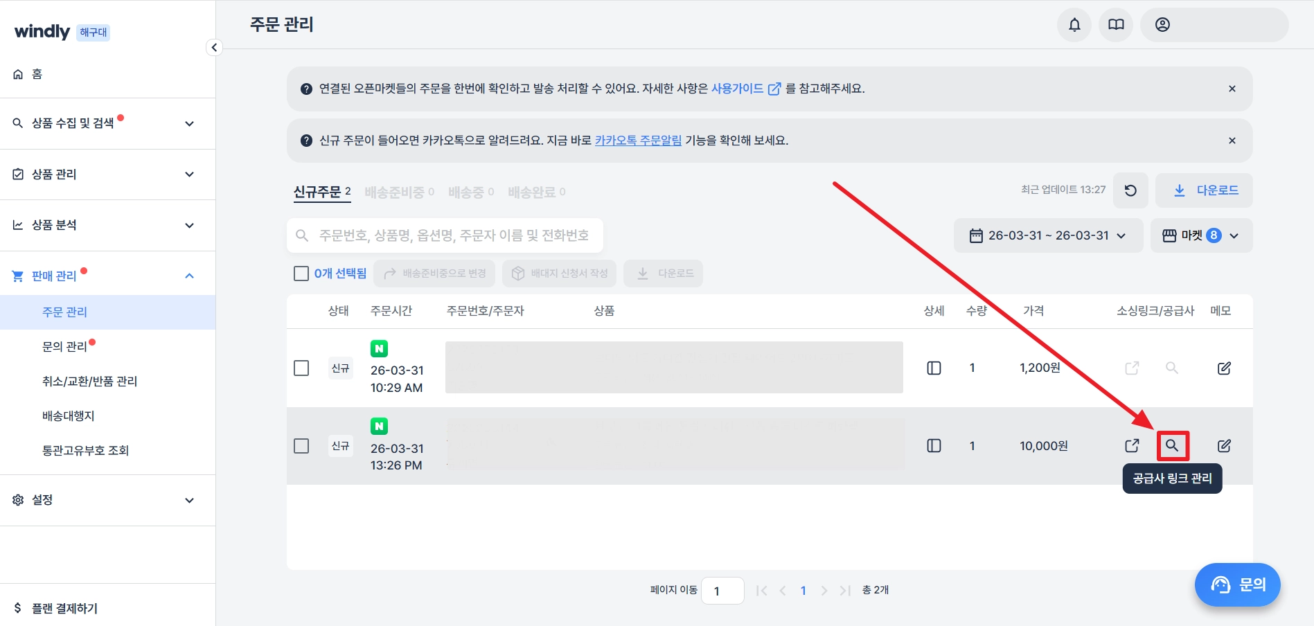 주문 관리 페이지 - 공급사 버튼 (돋보기 모양) 클릭 - 공급사 링크 관리 메뉴 클릭