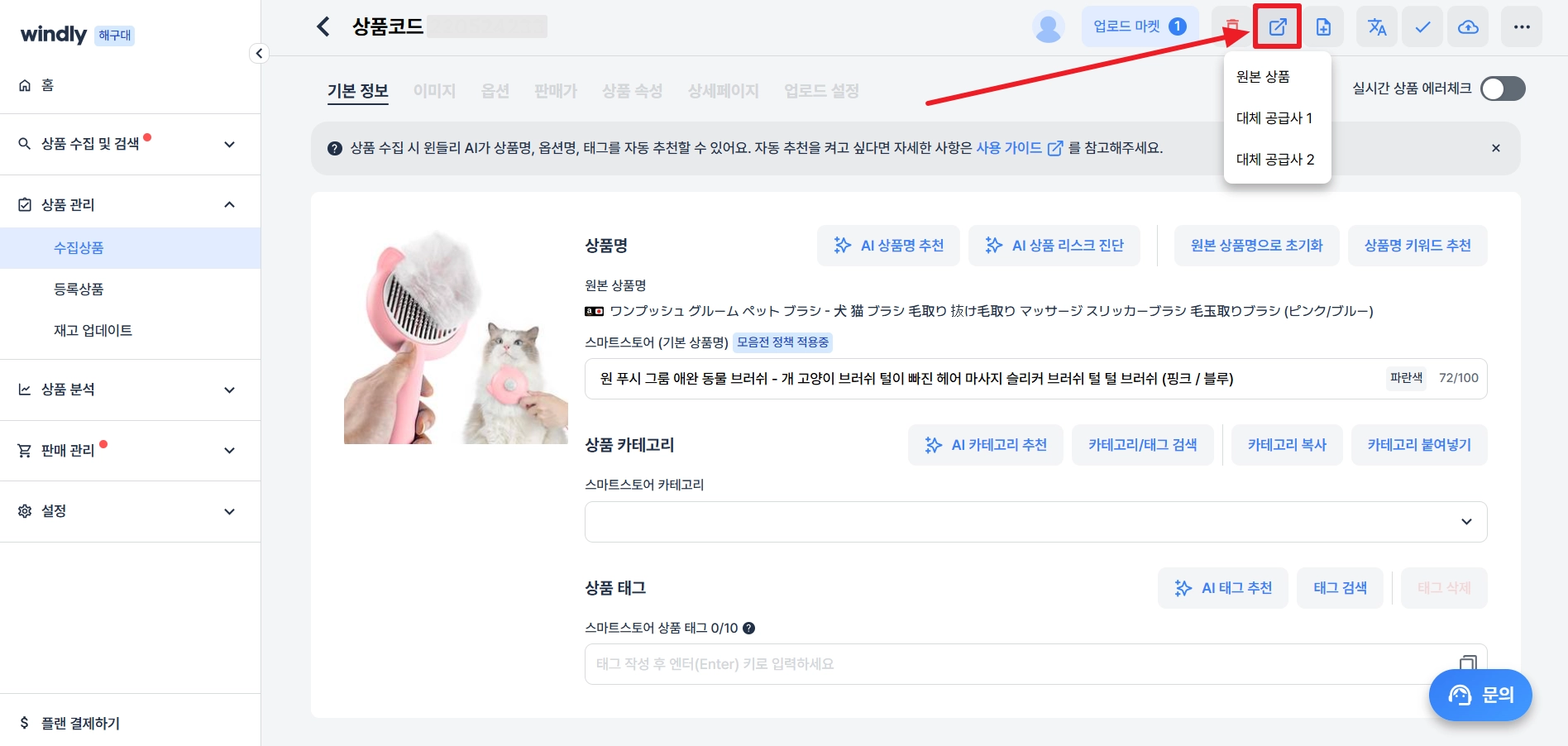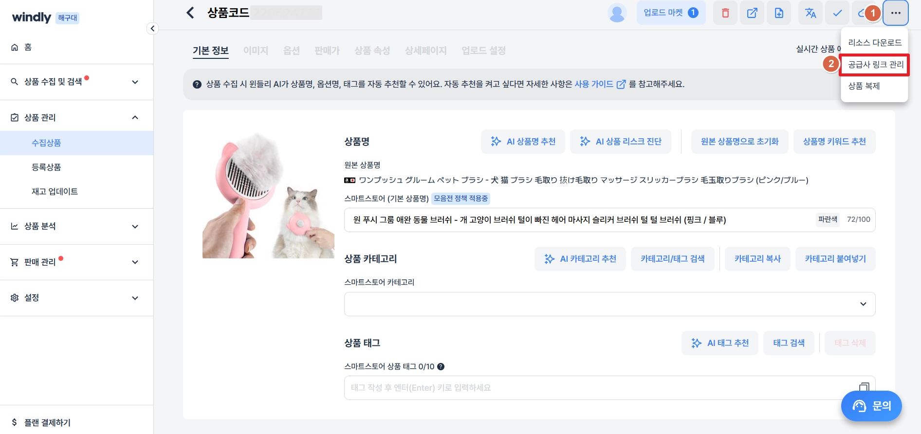 개별 상품 페이지 - 우측 상단의 ··· 버튼 클릭 - 공급사 링크 관리 메뉴 클릭