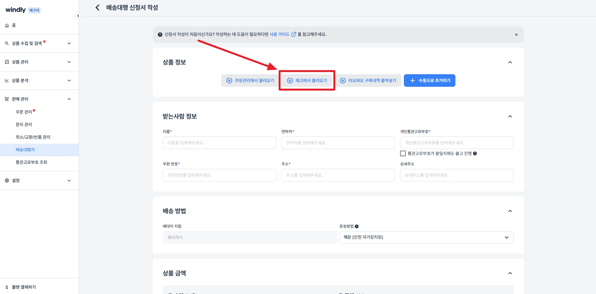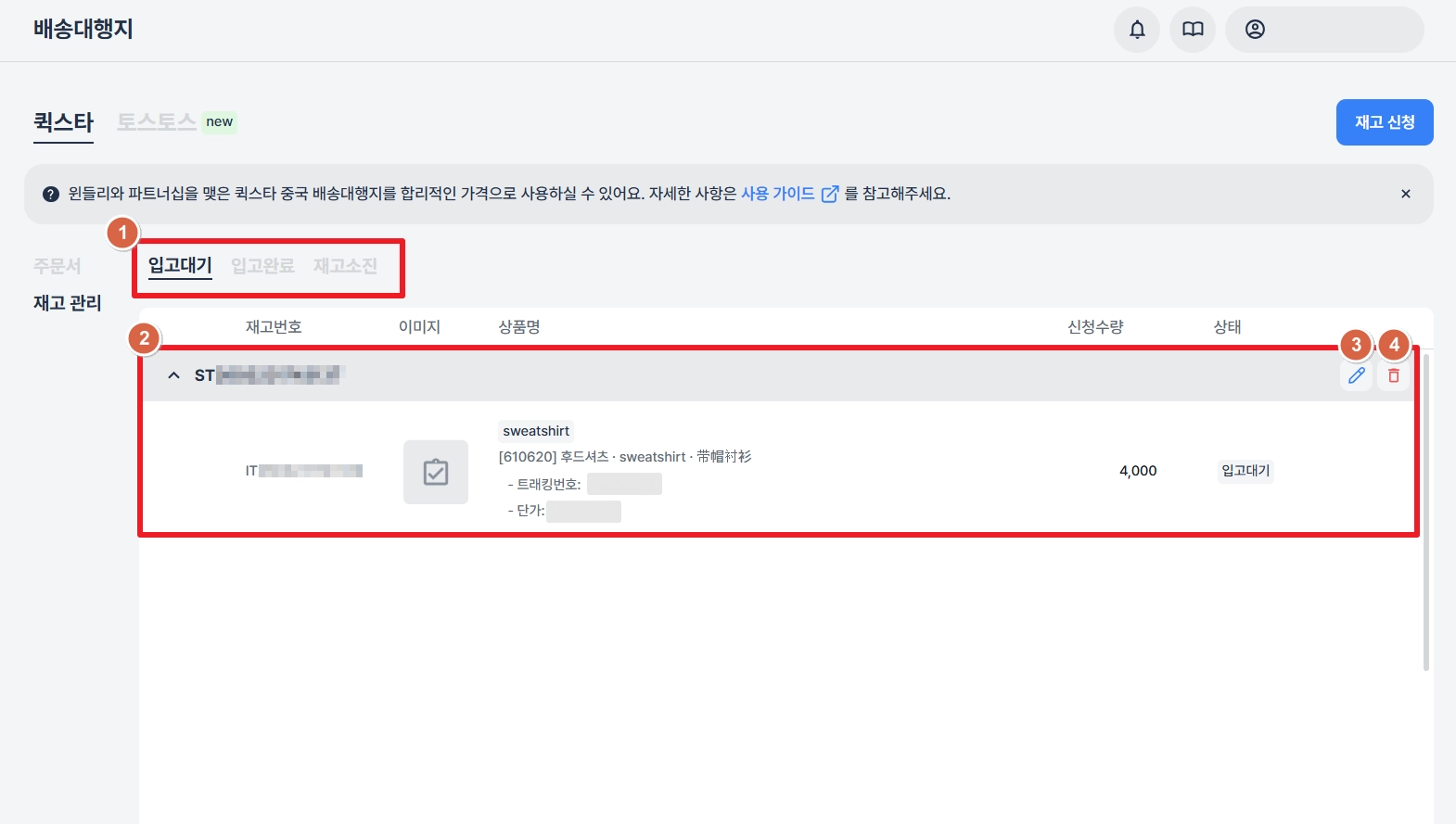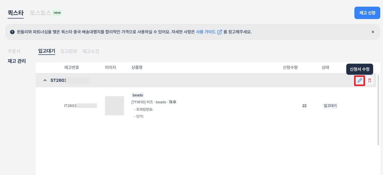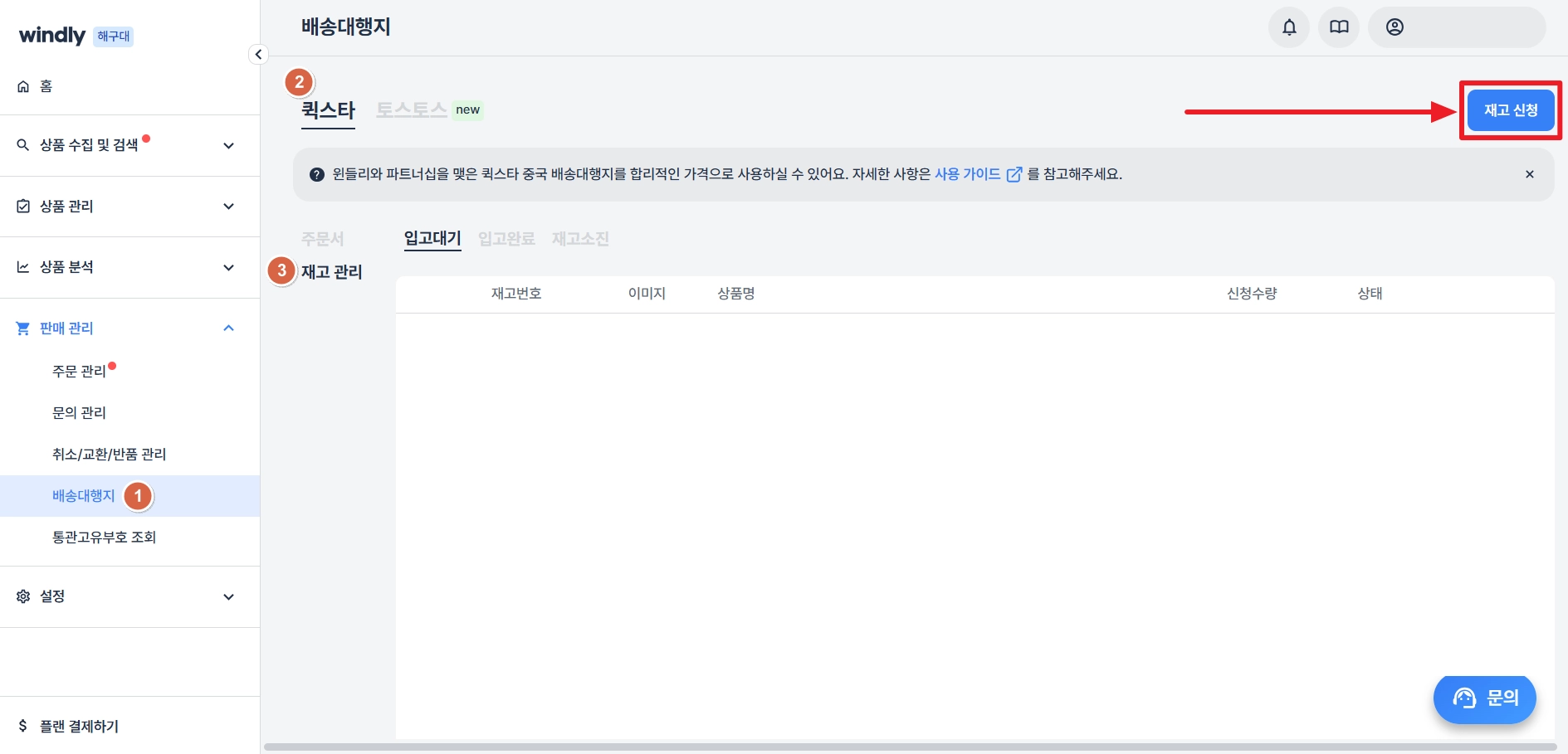 윈들리에서 ‘퀵스타’ 배송대행지의 재고 입고를 신청하고 사용할 수 있어요.