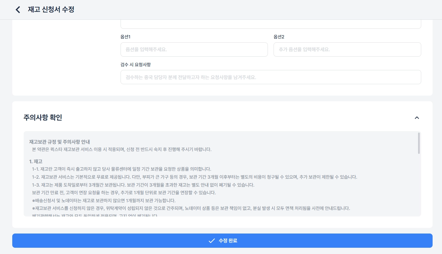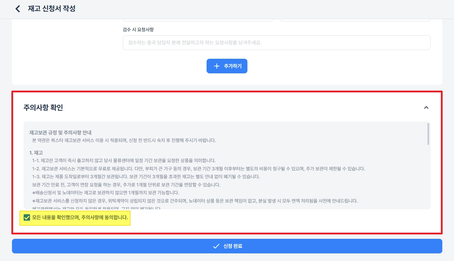 재고보관 규정 및 주의사항 안내를 확인하고, 주의사항 동의에 체크해 주세요.