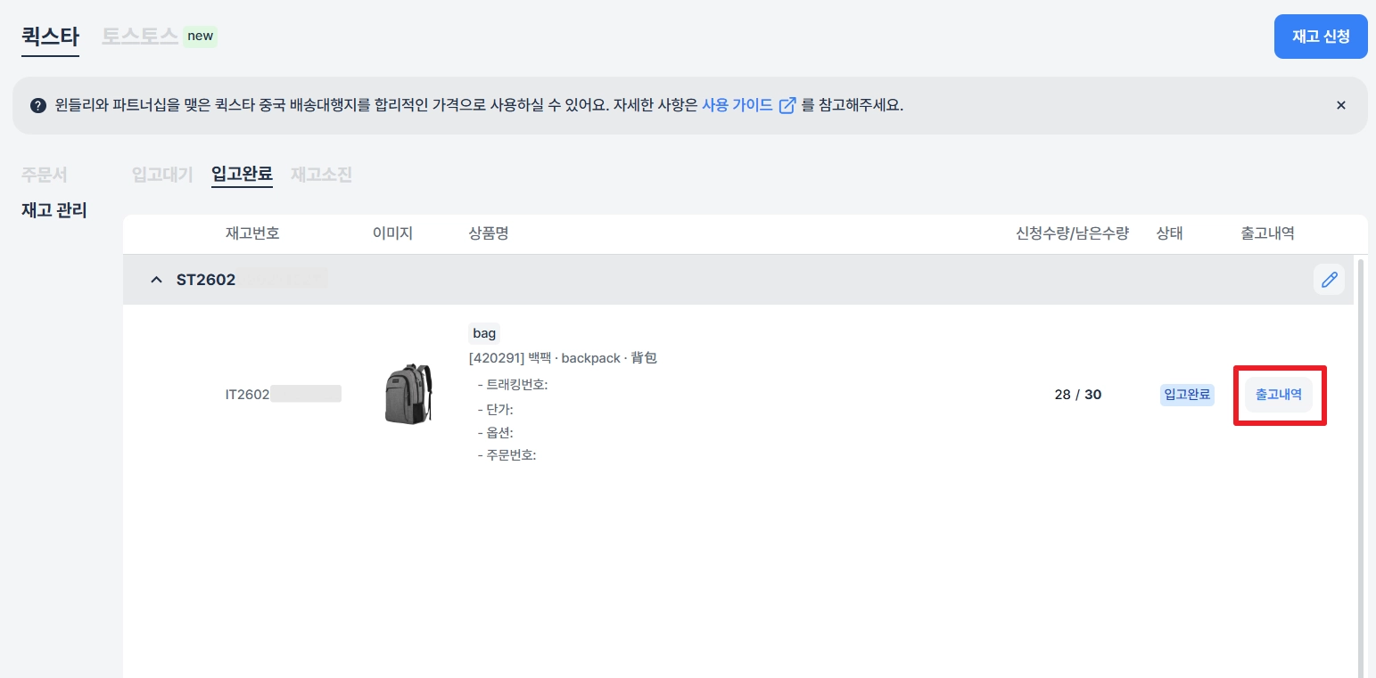 출고 내역: 입고 완료된 상품의 경우, 상품이 언제 얼마나 출고되었는지 확인할 수 있어요.