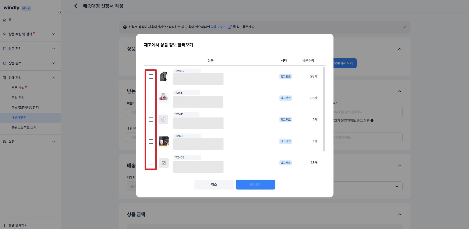입고 완료된 재고는 배송대행 신청서 작성 시 사용할 수 있어요.