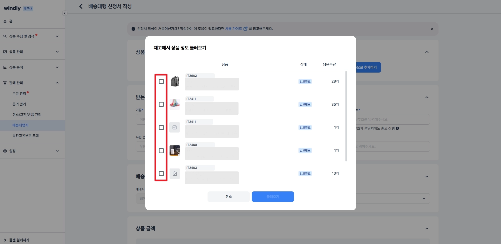 정보를 불러올 상품을 체크하여 ‘불러오기’ 버튼을 클릭해 주세요.