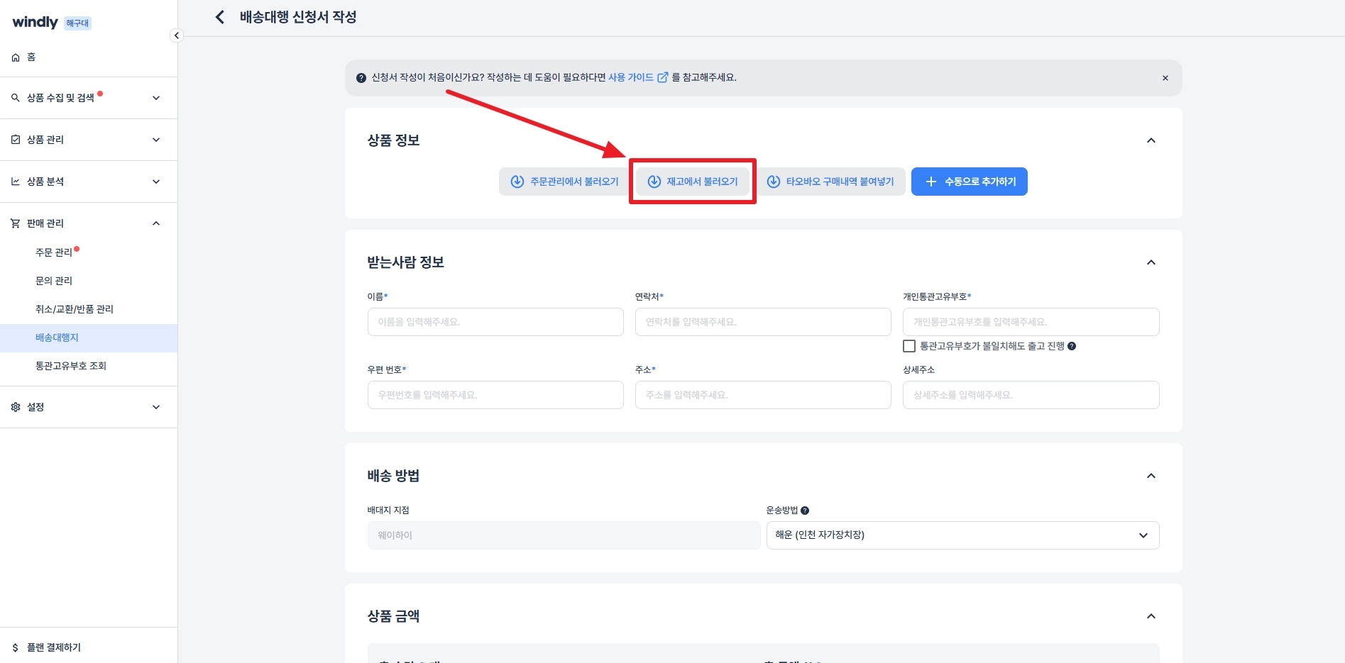 주문이 발생한 상품의 정보를 불러오거나, 직접 상품을 추가할 수 있어요.