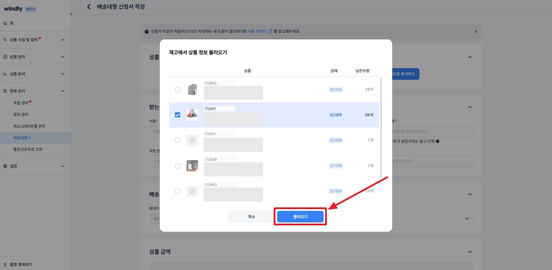 상품 정보 영역의 ‘재고에서 불러오기’ 버튼을 클릭해 주세요.