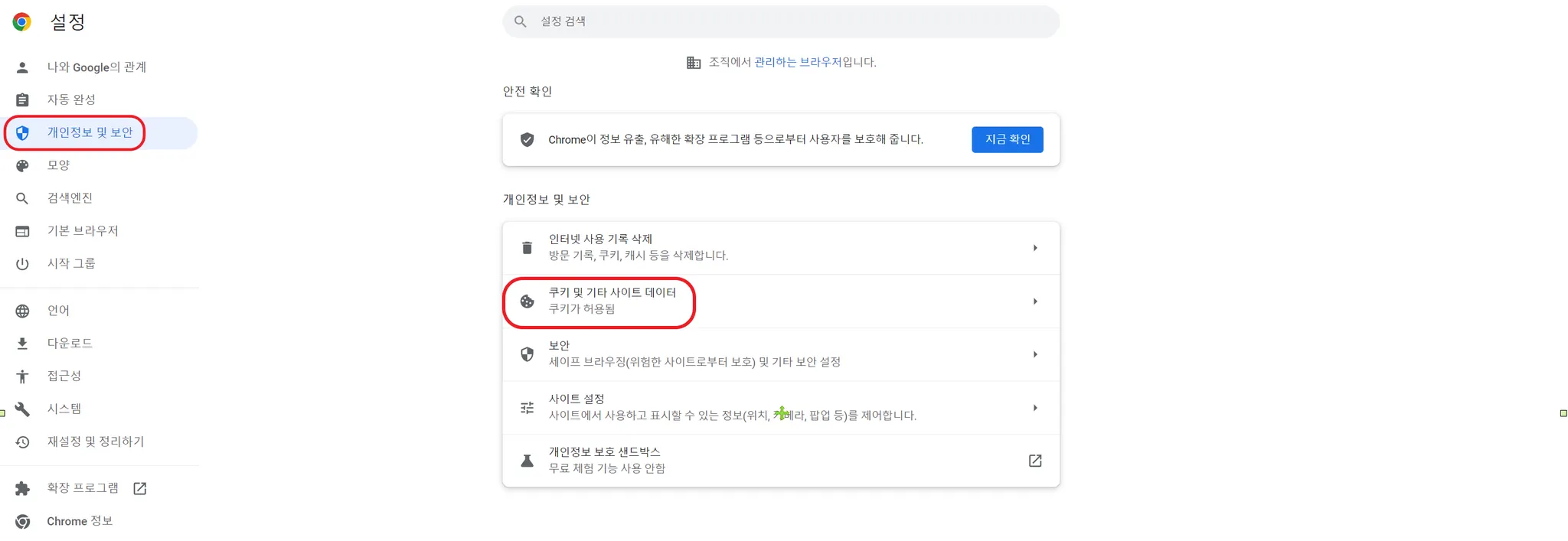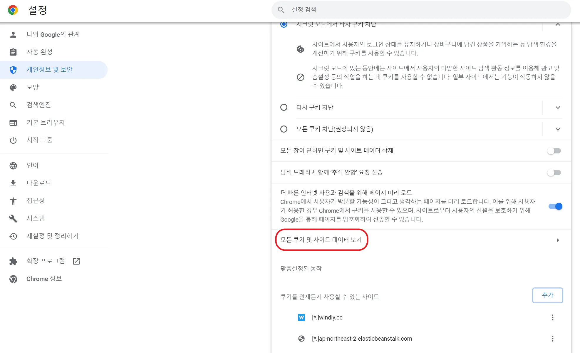 개인정보 및 보안 섹션에서, 쿠키 및 기타 사이트 데이터를 클릭하세요.