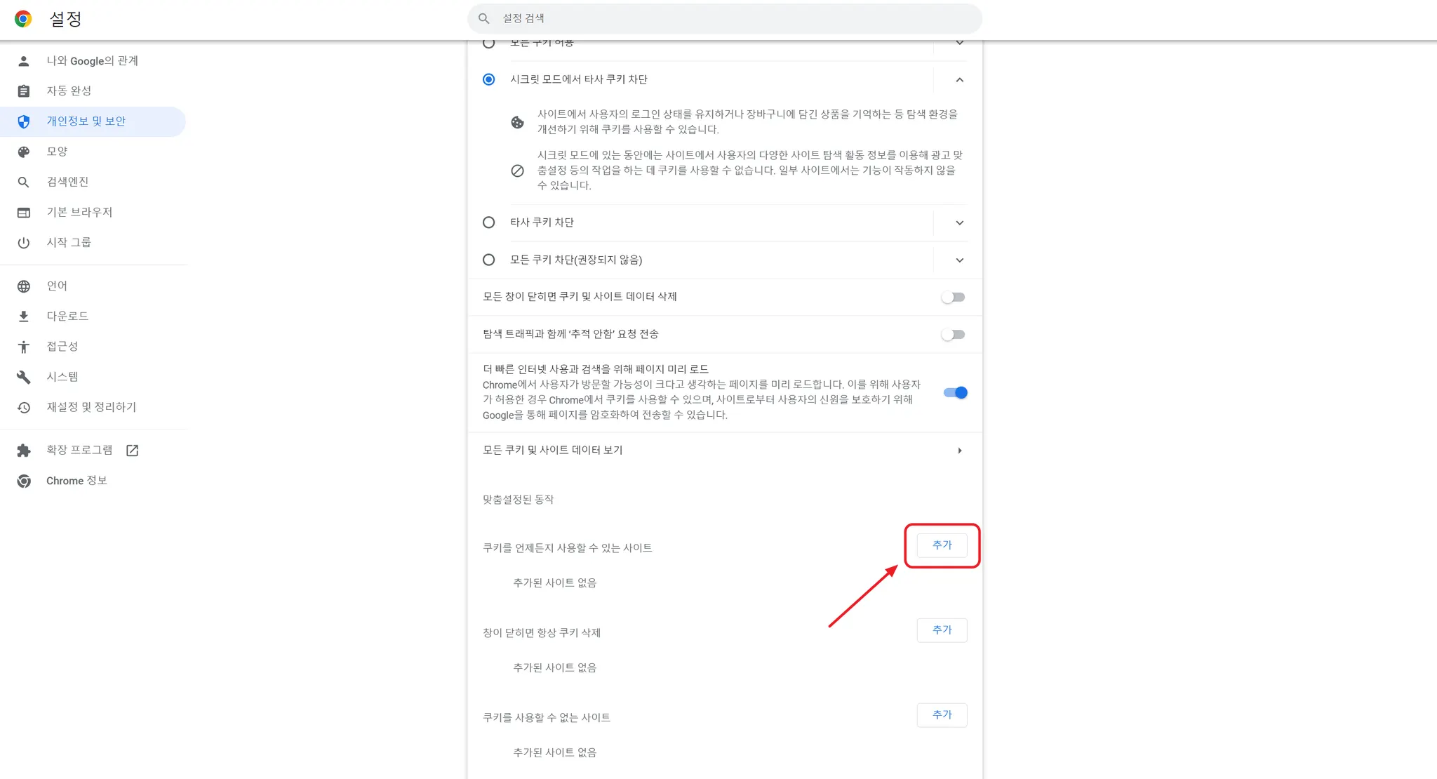 쿠키를 언제든지 사용할 수 있는 사이트로 스크롤하여 추가를 클릭하세요.